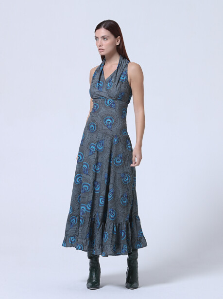 Vestito lungo con gonna leggermente svasata e raffinata balza finale, in fantasia conchiglia ventaglio grigio turchese. Questo elegante abito ha un corpetto molto particolare: presenta delle larghe e morbide spalline che possono essere regolate come un colletto di una camicia sul retro del collo e davanti con una scollatura incrociata. La parte dietro, da sotto il giro seno, è totalmente elasticizzata e arricciata, dettaglio che sfina il busto e la figura intera.