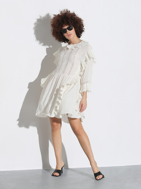 Minidress in crêpe de Chine di misto seta, di colore bianco con romantiche rouches plissé verticali e gonna morbida. Inserti di pizzo intarsiato, maniche a tre quarti e colletto tondo ampio con apertura a goccia sul davanti. Presenta un'arricciatura in vita e sottoveste rimovibile. Vestibilità regolare, leggermente comfort.