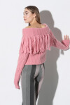 Maglia con applicazioni di frange, di colore rosa. Scollo ampio a barca e maniche lunghe lavorate con trame a trecce. Fondo regolare lungo alla vita. In misto mohair e acrilico, ha vestibilità regolare, leggermente comfort.