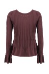 Microcardigan di colore bordeaux scuro in maglia a coste. Scollo tondo, maniche lunghe leggermente a sbfuffo con polsino. Volant sulla parte finale che cade morbida sui fianchi. Chiusura con bottocini ton sur ton lungo il petto. In misto viscosa, vestibilità da skinny a regular, in base all'effetto desiderato.