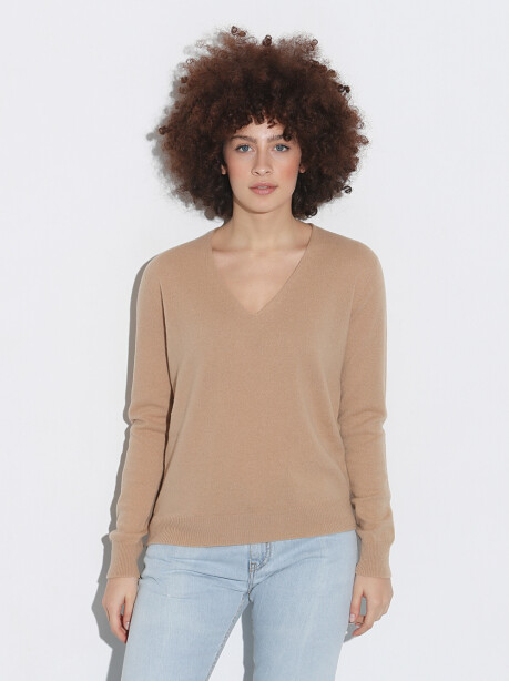 Maglia scollo a V in misto lana e cachemire, di colore cammello. Maniche lunghe con polsino e fondo regolare sui fianchi. Dettaglio in lavorazione a costine sui polsi e sul fondo. Ha un vestibilità regolare, tendente a slim.