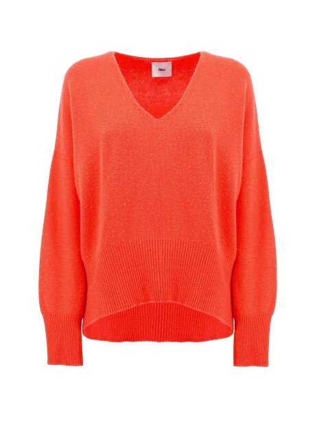 Maglione scollo a V modello a scatola in misto lana e cachemire, di colore arancione. Linea morbida con maniche lunghe e polsino alto. Dettaglio in lavorazione a costine su polsi e fondo. Leggermente più corto davanti con fondo con linea ovale che poggia sui fianchi. Ha una vestibilità comfort, tendente a over.