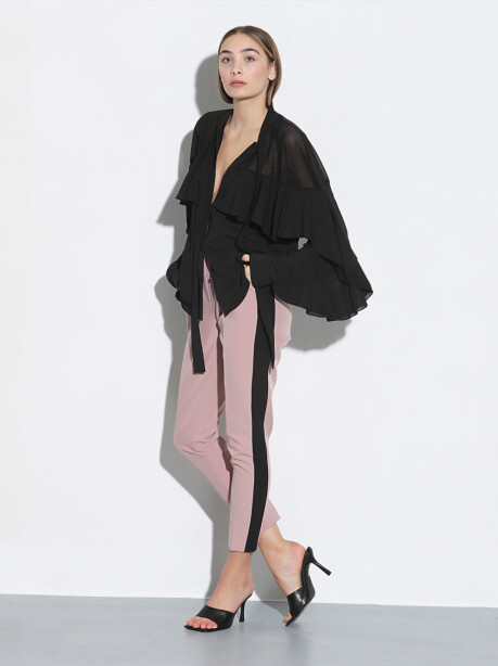 Camicia con rouches, fusciacca alla gola e trasparenze di colore nero.