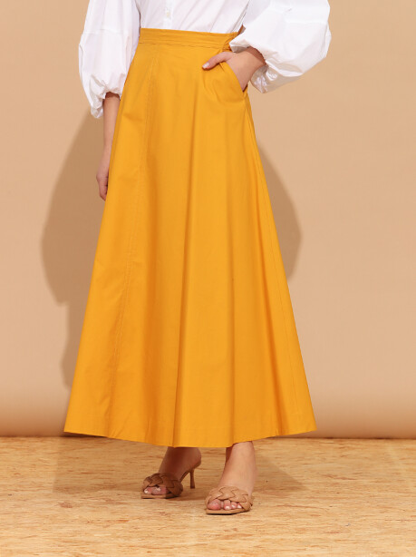 Gonna in cotone di colore zafferano, modello alto in vita con chiusura a zip, lunghezza alla caviglia.