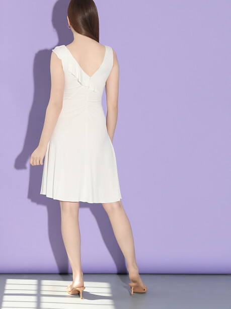 Abito lunghezza midi ,senza maniche dalla caratteristica silhouette svasata di ispirazione anni 70, con profondo scollo a V, sia davanti che sul retro, sottolineato da volant, di colore bianco.