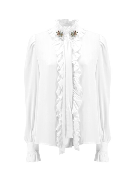 Camicia con applicazioni di stampo vittoriano, maniche lunghe semi-blouson e rouches sul fronte e polsini, colletto alto con fiocco annodato, di colore bianco.