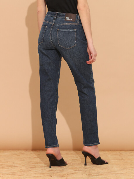 Jeans cinque tasche modello skinny con zip e vita media, denim blu comfort, effetto vintage scuro con leggera sabbiatura sul davanti.