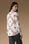 Camicia in tessuto creponne jacquard con disegno rose che creano un pattern geometrico. Scollo tondo profilato da rouche e completato da nastro da annodare a fiocco e maniche lunghe leggermente a sbuffo chiuse da polsino al fondo. Chiusura con bottoni davanti, di colore bianco.