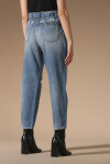 Jeans cinque tasche mom-fit in denim twill rigido di puro cotone caratterizzato da strappi e rotture sia davanti che sul retro. Vita alta con passanti per cintura, elastico e arriccio sul retro. Gamba dalla linea dritta, leggermente più stretta al fondo. Logo PINKO effetto consumato stampato sul retro. Chiusura con zip e bottone in metallo, di colore blu chiaro.