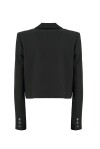 Blazer cropped modello doppiopetto con solo due bottoni, tagliato all'altezza del bacino, di colore nero. Revers a lancia, maniche lunghe con bottoni e spalle leggermente squadrate.