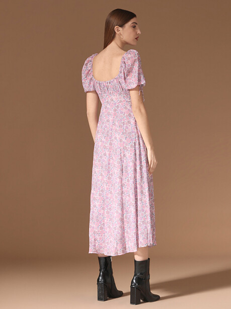 Abito midi in chiffon con stampa floreale "Woodstock" nelle nuance del rosa ispirato agli anni '70 con busto arricciato, spacco alto fino alla coscia con bottoni, orlo asimmetrico fluido. Maniche a sbuffo chiuse con lacci. Completamente foderato.