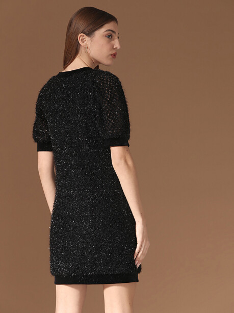 Vestito in maglia lurex di colore nero, modello corto sopra al ginocchio, maniche traforate a tre quarti, rifinito con bordature effetto raso e bottoni sul fronte.